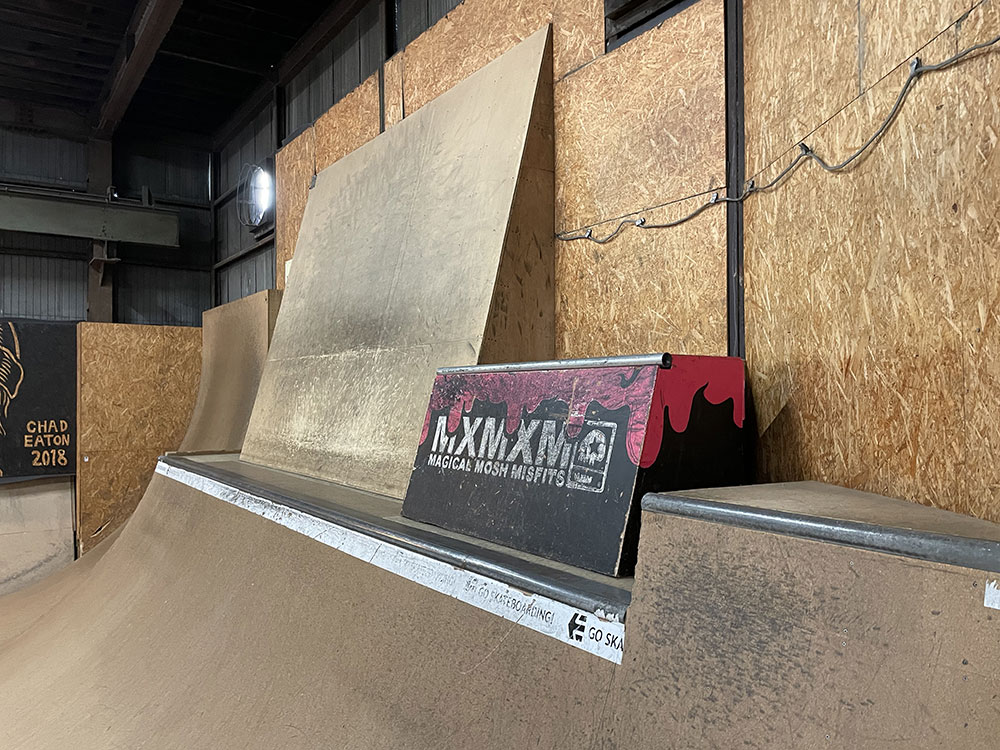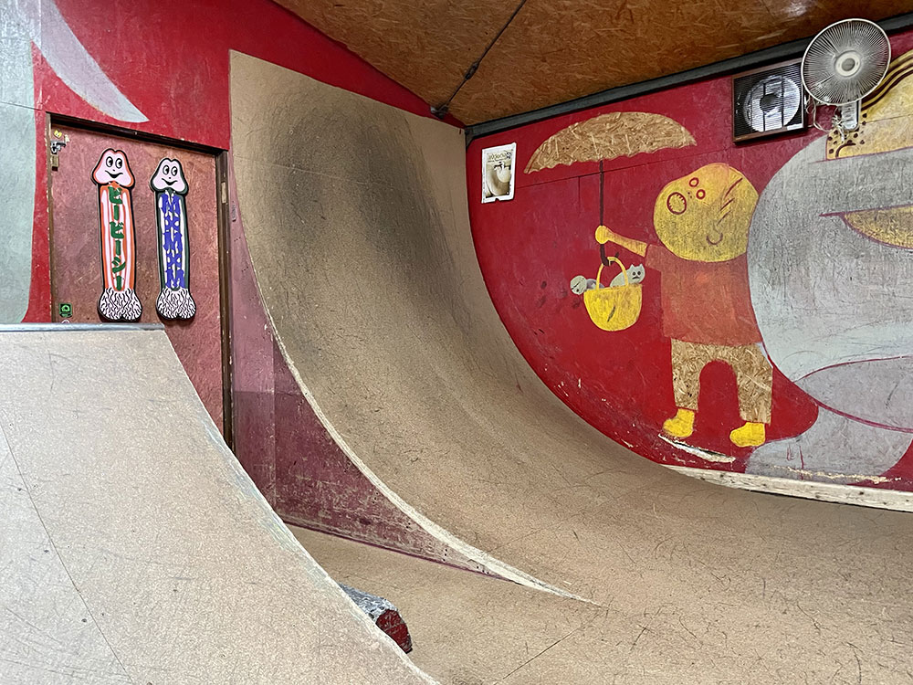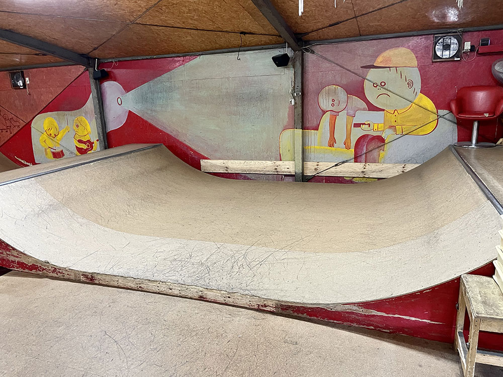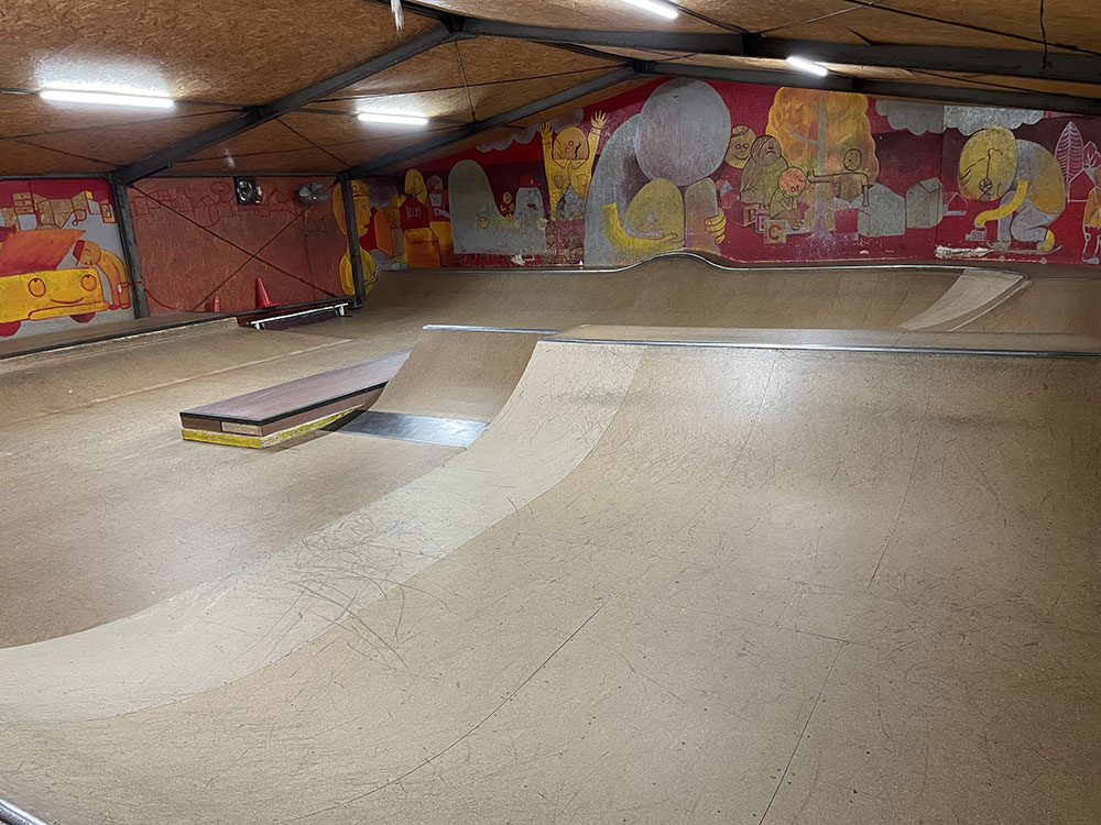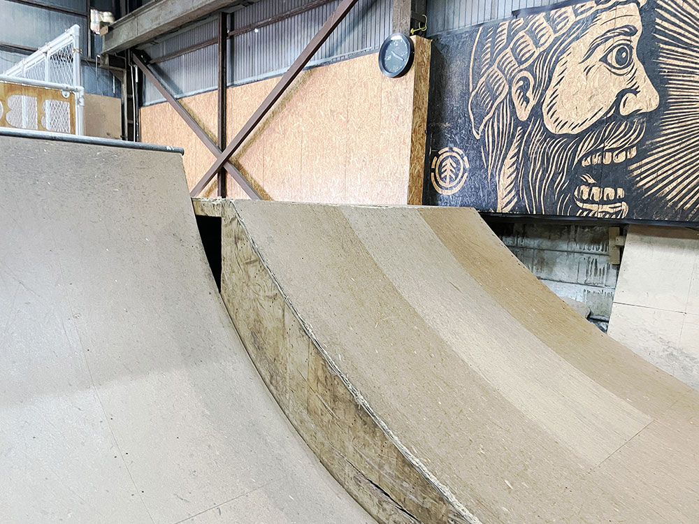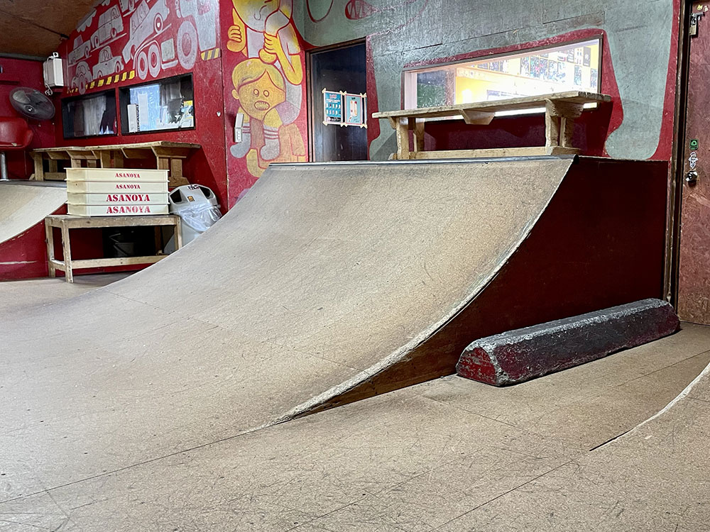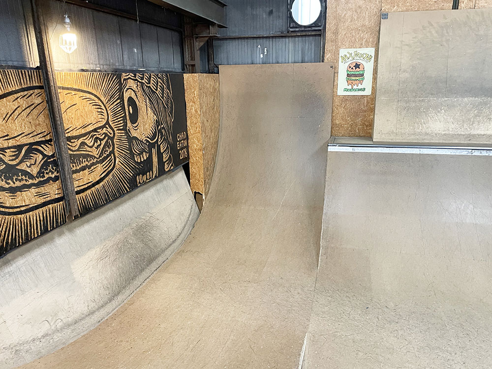 2015年にオープンしました川口店は2階建ての倉庫にスケートパークがはいっております。シャッターにはハンバーガーがスケートボードをしており目印になっております。受付ボウル側2階にあるよ!